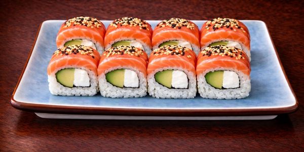 8 makis au fromage et à l’avocat couverts d’une fine tranche de saumon et de graines de sésame.