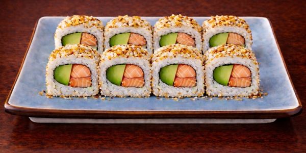 8 makis au fromage et à l’avocat couverts d’une fine tranche de saumon et de graines de sésame.