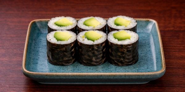 8 makis à l’avocat, fromage, saumon cru et graines de sésame.