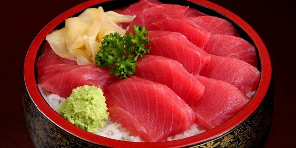 Fines tranches de thon posées sur un grand bol de riz vinaigré